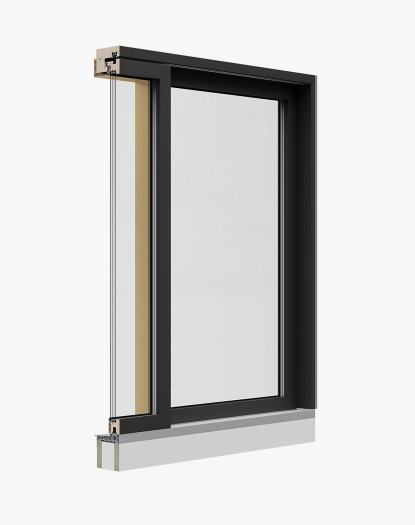 Moderne und dauerhafte Holz-Metall-Hebeschiebetür, die Innovation, Design und Handwerk vereint und sich spielend einfach öffnen und schliessen lässt.