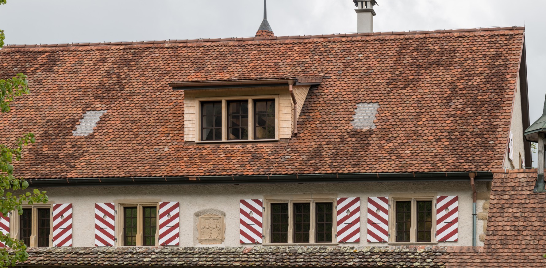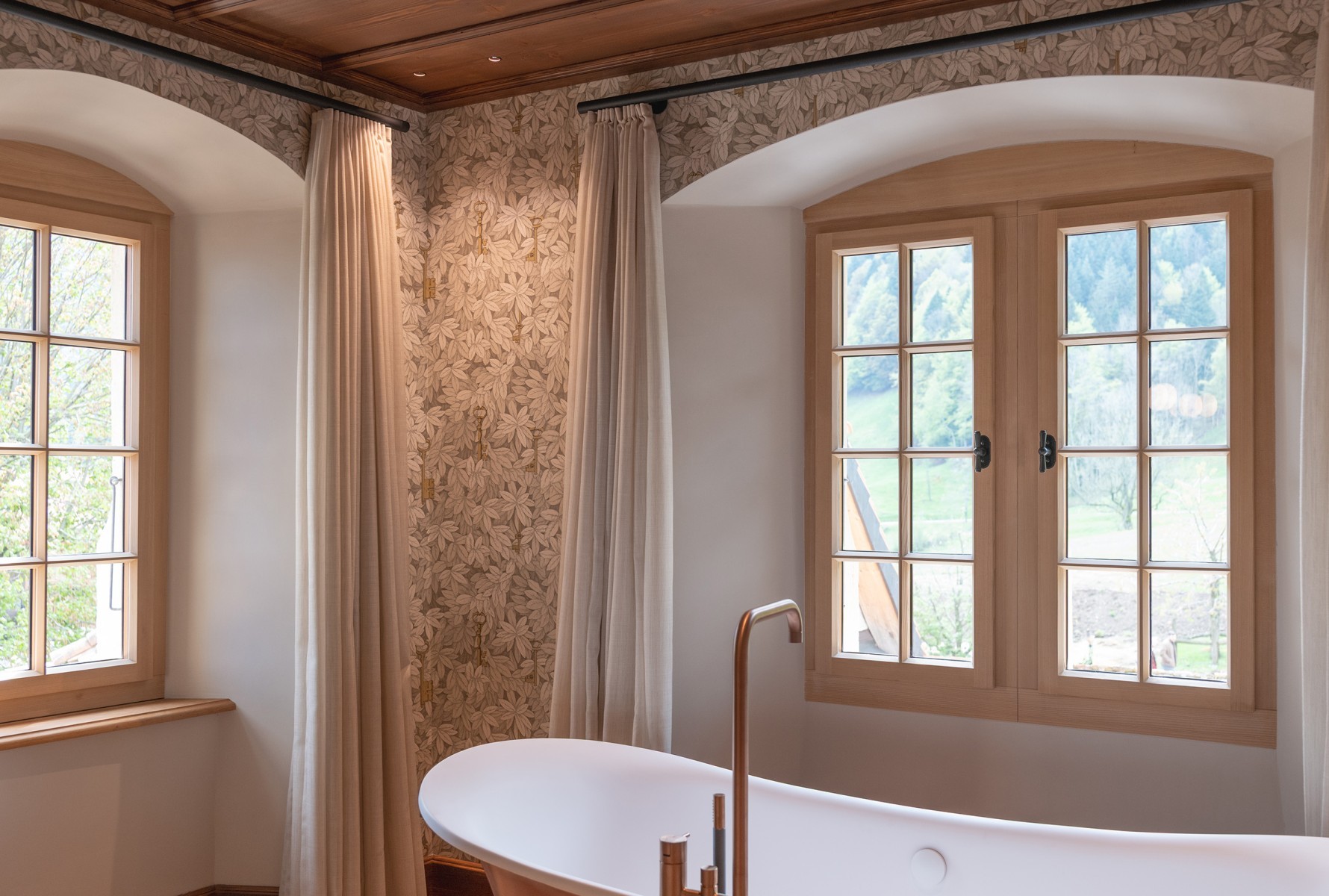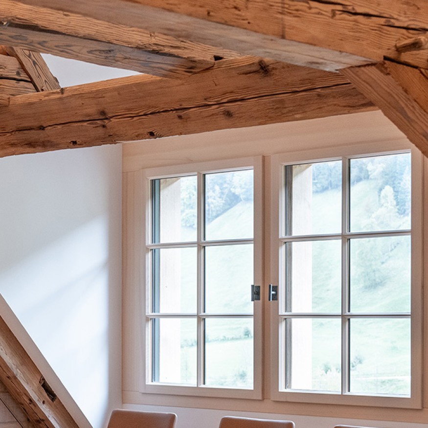 Mit den traditionellen Sprossen und den individuell gefertigten Rahmenprofilen betonen die Fenster den Charakter und die Materialität der unterschiedlich gestalteten Räume und setzen einen markanten Kontrast zum traditionellen Holztragwerk. Für die äussere Aluminiumschale wurde ein dunkler Farbton gewählt, sodass sich die Fenster denkmalpflegerisch in die bestehende Architektur einfügen und die historischen Fensterläden in Rot-Weiss hervorheben. Dank der schlanken und sorgfältig verarbeiteten Profile gelangt viel Tageslicht in die traditionellen Schlossräume, während Temperaturschwankungen ausgeglichen und der Energieverbrauch langfristig gesenkt werden.