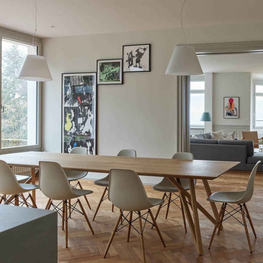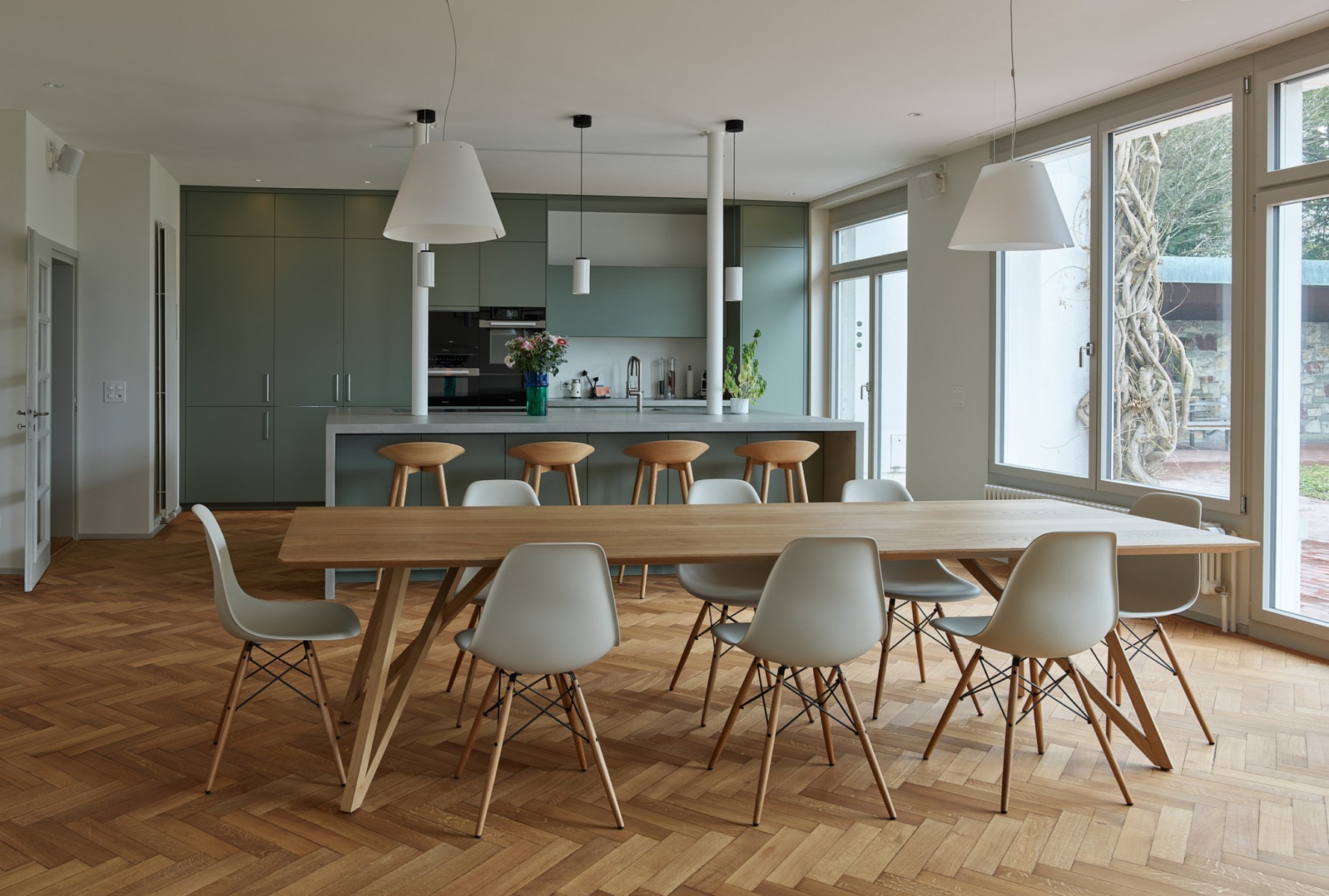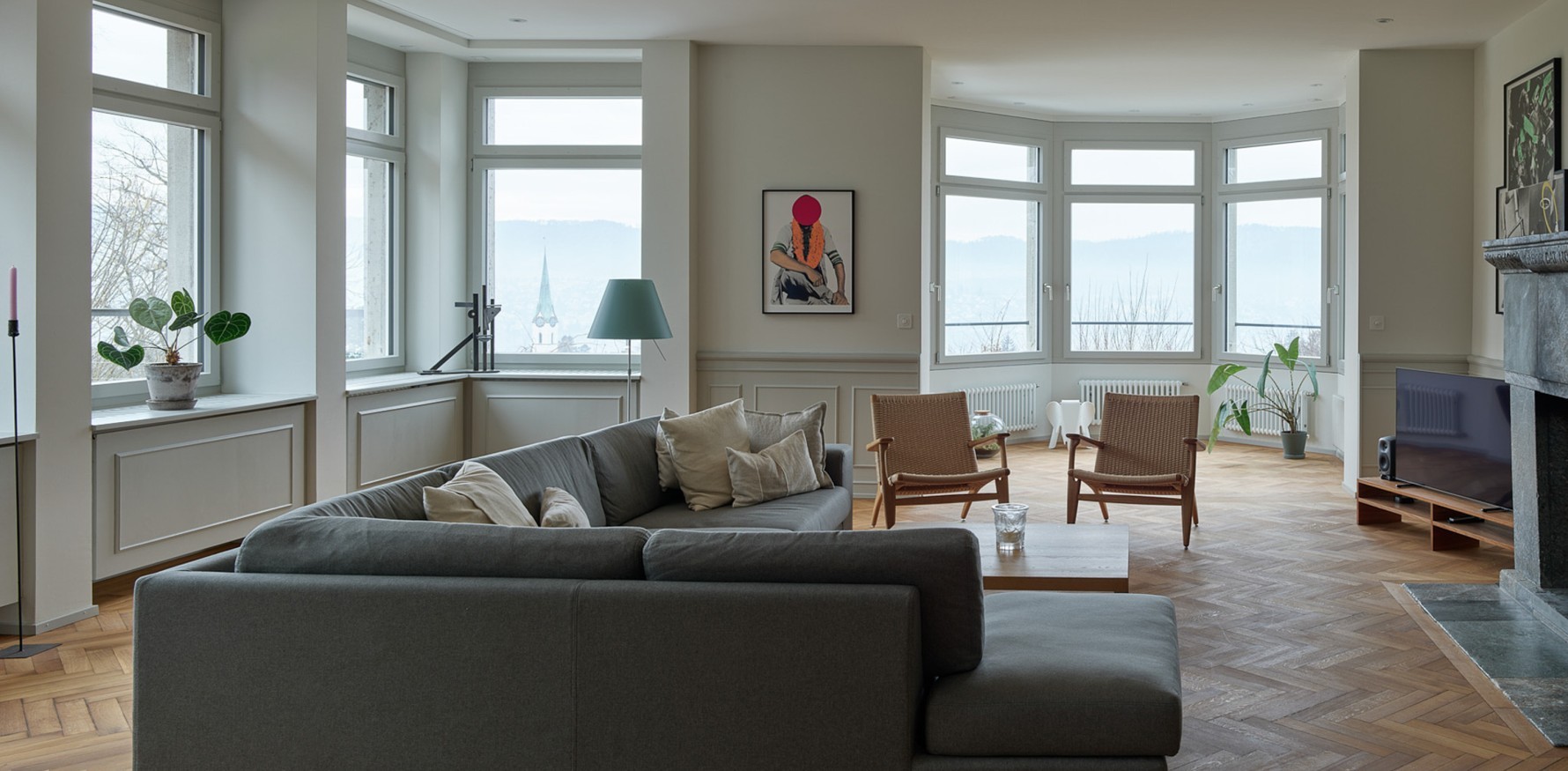 Die grosszügigen Fensterfronten mit ihren charakteristischen Sitzbänken und Erkern prägen den Wohnbereich des Einfamilienhauses in Zollikon. Diese architektonische Qualität zu bewahren und gleichzeitig den Komfort sowie die Energieeffizienz moderner Fenster sicherzustellen, stand im Zentrum der Renovation. Mit den energieeffizienten Renovationsfenstern von Kläusler bleibt die ursprüngliche Fensterstruktur erhalten. Dank der schlanken Flügelprofile und der hellen Fensterrahmen fügen sich die Holz-Metall-Fenster harmonisch in den neuen grosszügigen Innenausbau ein.