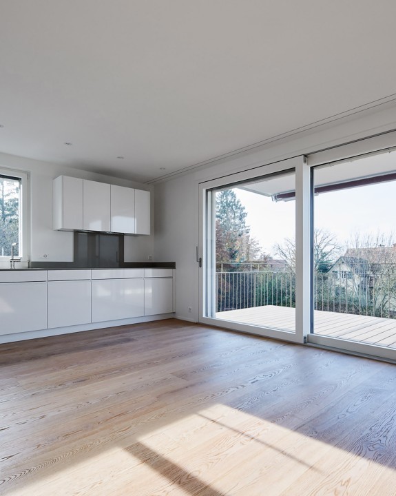 Kläusler Fenster empfiehlt für die drei Familienwohnungen die Holz-Metall-Fenster aus der L-Fensterserie sowie die hochwertigen Holz-Metall-Hebeschiebetüren. Die Fenster und Türen werden individuell auf die jeweilige Architektur der drei Familienwohnungen, die Grösse und die Funktion der Fenster nach Mass gefertigt.