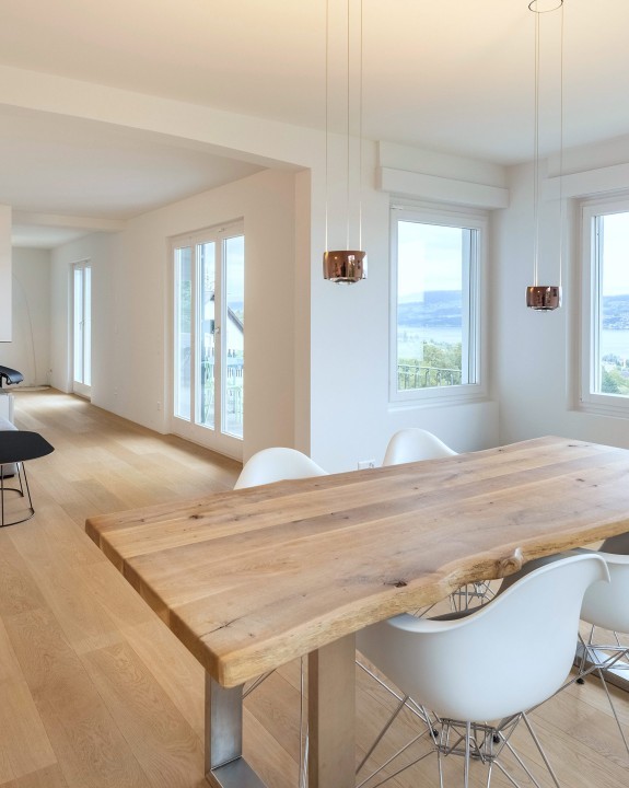 Im Rahmen einer Totalsanierung werden alle Fenster mit dem zertifizierten Kläusler Holz Metall Fenster L ersetzt und die Blicke weit über den Zürichsee geöffnet.