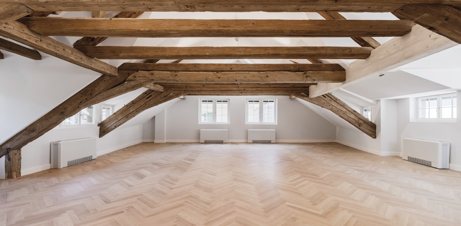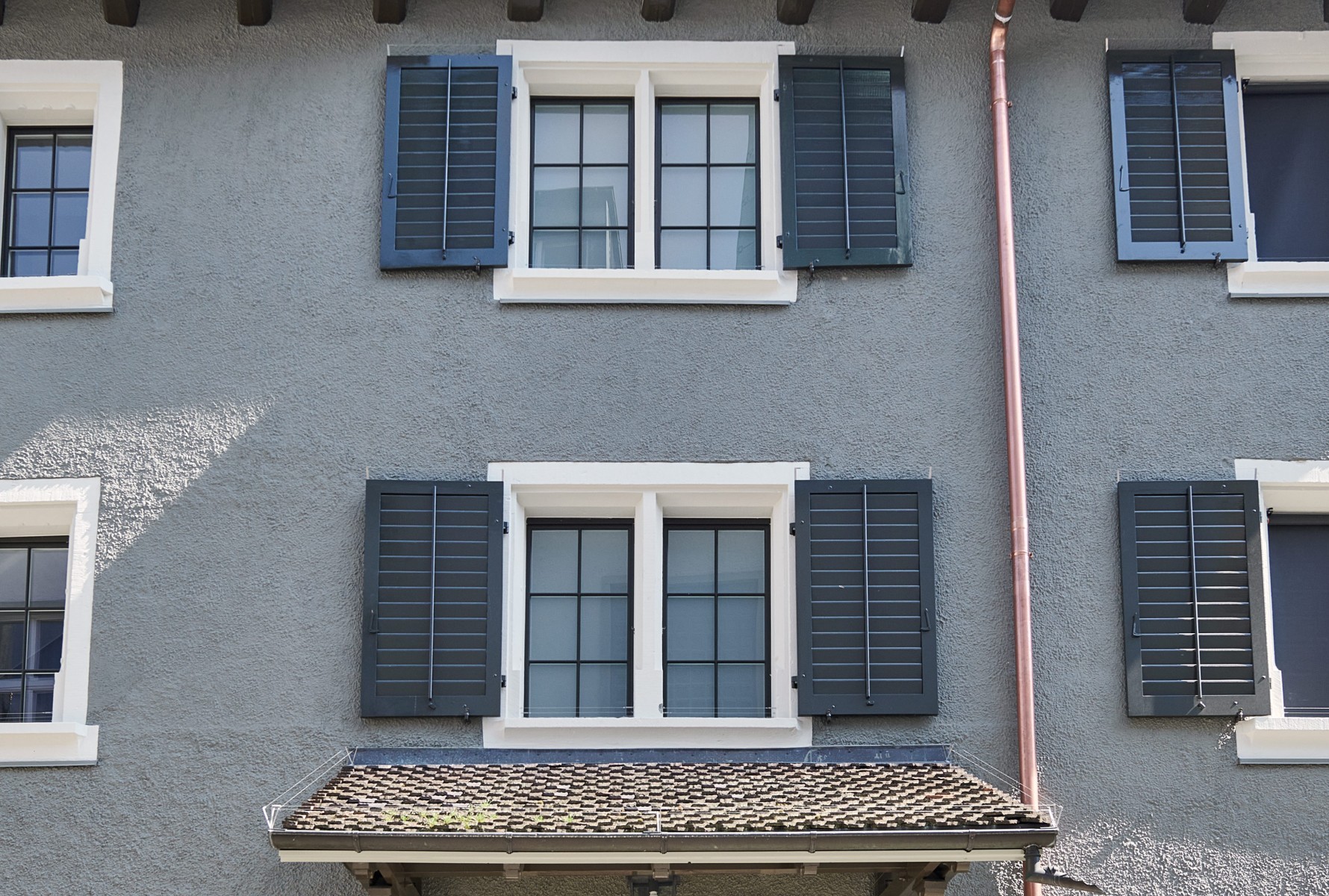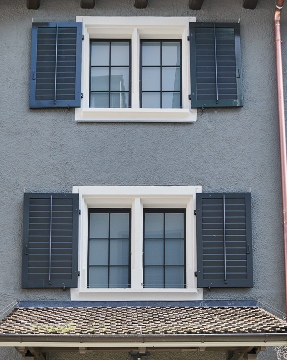 Das sorgfältig konstruierte Kläusler Holzfenster TR erfüllt mit seinen schlanken Flügelprofilen, der schmalen Mittelpartie und den Sprossen die denkmalpflegerischen Vorgaben und fügt sich durch den dunklen Farbton markant in die Fassade des Gebäudes ein. Im Innern sorgen die Holzfenster für viel Licht, schützen vor Lärm und bringen durch ihren Weissanstrich Helligkeit in die für diese Zeit typisch geringe Raumhöhe.