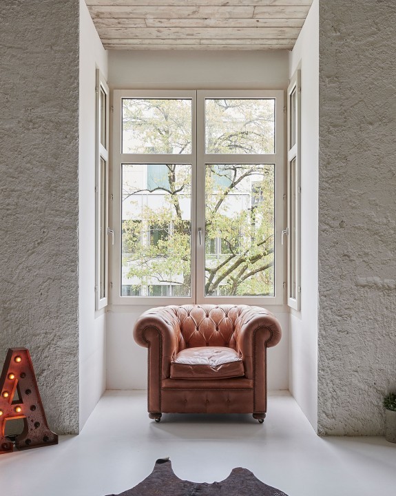 Rund um die Loftwohnungen herrscht oft emiges Treiben. Gleichzeitig bieten sich von innen schöne Ausblicke auf die in den warmen Monaten begrünte Strasse. Die von Kläusler Fenster gefertigten Fenster reihen sich harmonisch in die Architektur der Wohnungen ein und erfüllen die Anforderungen an den Lärmschutz und die Energieeffizienz. Die Holz-Aluminium-Fenster sind innen in einem sanften Beigeton gestrichen und passen sich der aussergewöhnlichen Materialisierung der Loftwohnungen perfekt an.